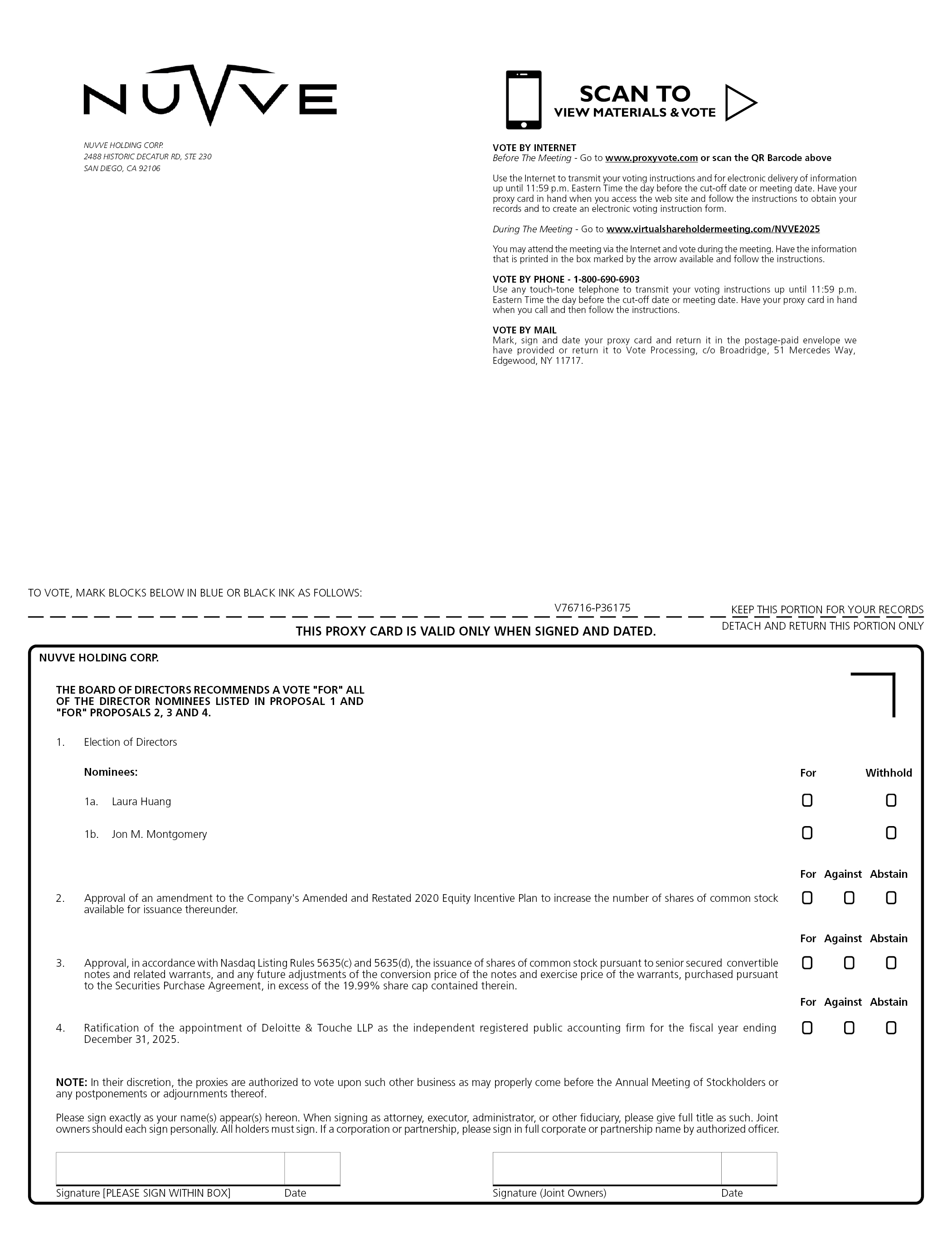 NUVVE HOLDING CORP. 2488 HISTORIC DECATUR RD, STE 230 SAN DIEGO, CA 92106 VOTE BY INTERNET Before The Meeting - Go to www.proxyvote.com or scan the QR Barcode above Use the Internet to transmit your voting instructions and for electronic delivery of information up until 11:59 p.m. Eastern Time the day before the cut-off date or meeting date. Have your proxy card in hand when you access the web site and follow the instructions to obtain your records and to create an electronic voting instruction form. During The Meeting - Go to www.virtualshareholdermeeting.com/NVVE2025 You may attend the meeting via the Internet and vote during the meeting. Have the information that is printed in the box marked by the arrow available and follow the instructions. VOTE BY PHONE - 1-800-690-6903 Use any touch-tone telephone to transmit your voting instructions up until 11:59 p.m. Eastern Time the day before the cut-off date or meeting date. Have your proxy card in hand when you call and then follow the instructions. VOTE BY MAIL Mark, sign and date your proxy card and return it in the postage-paid envelope we have provided or return it to Vote Processing, c/o Broadridge, 51 Mercedes Way, Edgewood, NY 11717. TO VOTE, MARK BLOCKS BELOW IN BLUE OR BLACK INK AS FOLLOWS: V76716-P36175 KEEP THIS PORTION FOR YOUR RECORDS THIS PROXY CARD IS VALID ONLY WHEN SIGNED AND DATED. DETACH AND RETURN THIS PORTION ONLY NUVVE HOLDING CORP. THE BOARD OF DIRECTORS RECOMMENDS A VOTE “FOR” ALL OF THE DIRECTOR NOMINEES LISTED IN PROPOSAL 1 AND “FOR” PROPOSALS 2, 3 AND 4. 1. Election of Directors Nominees: Nominees: 1a. Laura Huang 1b. Jon M. Montgomery 2. Approval of an amendment to the Company’s Amended and Restated 2020 Equity Incentive Plan to increase the number of shares of common stock available for issuance thereunder. 3. Approval, in accordance with Nasdaq Listing Rules 5635(c) and 5635(d), the issuance of shares of common stock pursuant to senior secured convertible notes and related warrants, and any future adjustments of the conversion price of the notes and exercise price of the warrants, purchased pursuant to the Securities Purchase Agreement, in excess of the 19.99% share cap contained therein. 4. Ratification of the appointment of Deloitte & Touche LLP as the independent registered public accounting firm for the fiscal year ending December 31, 2025. NOTE: In their discretion, the proxies are authorized to vote upon such other business as may properly come before the Annual Meeting of Stockholders or any postponements or adjournments thereof. Please sign exactly as your name(s) appear(s) hereon. When signing as attorney, executor, administrator, or other fiduciary, please give full title as such. Joint owners should each sign personally. All holders must sign. If a corporation or partnership, please sign in full corporate or partnership name by authorized officer. Signature [PLEASE SIGN WITHIN BOX] Date Signature (Joint Owners) Date