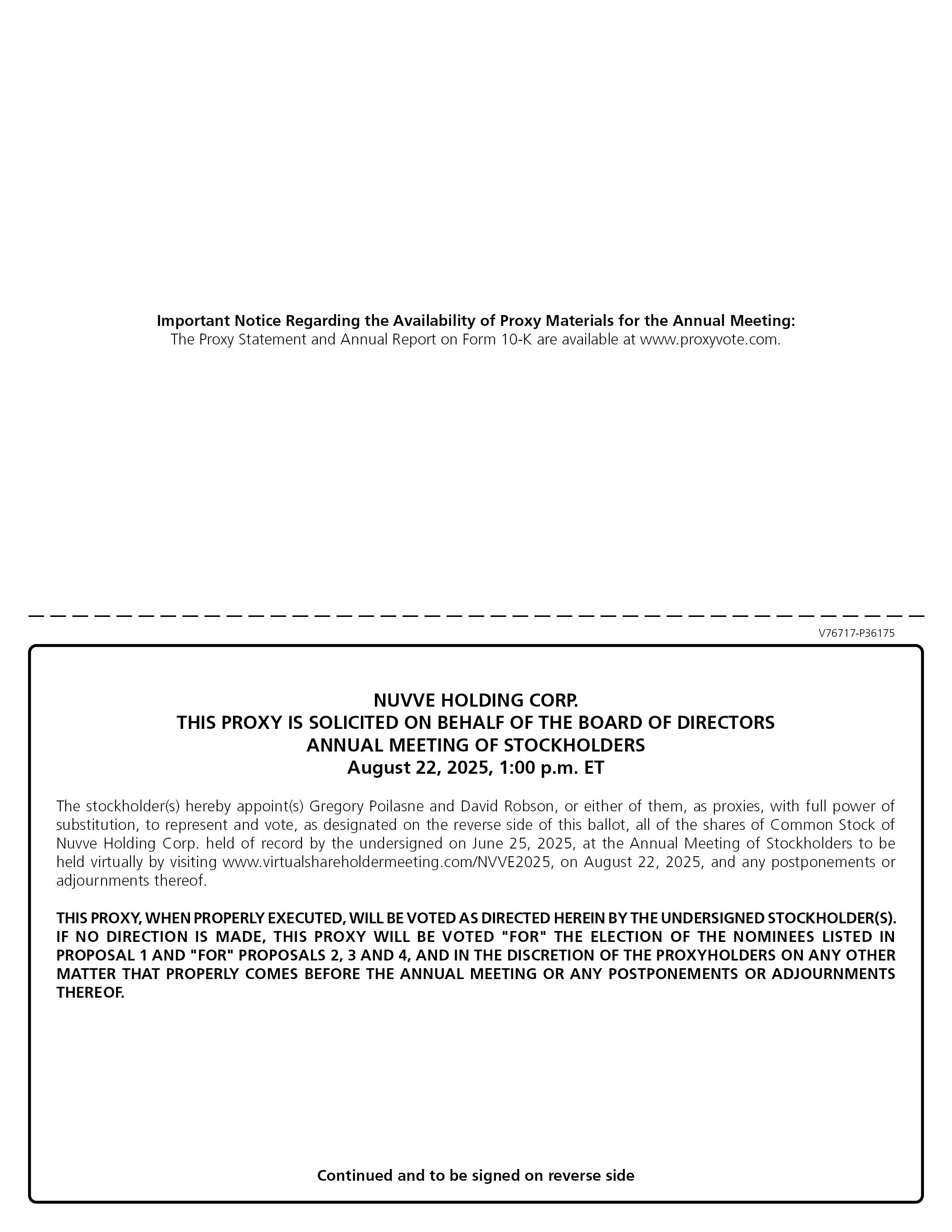 Important Notice Regarding the Availability of Proxy Materials for the Annual Meeting: The Proxy Statement and Annual Report on Form 10-K are available at www.proxyvote.com. NUVVE HOLDING CORP. THIS PROXY IS SOLICITED ON BEHALF OF THE BOARD OF DIRECTORS ANNUAL MEETING OF STOCKHOLDERS August 22, 2025, 1:00 p.m. ET The stockholder(s) hereby appoint(s) Gregory Poilasne and David Robson, or either of them, as proxies, with full power of substitution, to represent and vote, as designated on the reverse side of this ballot, all of the shares of Common Stock of Nuvve Holding Corp. held of record by the undersigned on June 25, 2025, at the Annual Meeting of Stockholders to be held virtually by visiting www.virtualshareholdermeeting.com/NVVE2025, on August 22, 2025, and any postponements or adjournments thereof. THIS PROXY, WHEN PROPERLY EXECUTED, WILL BE VOTED AS DIRECTED HEREIN BY THE UNDERSIGNED STOCKHOLDER(S). IF NO DIRECTION IS MADE, THIS PROXY WILL BE VOTED “FOR” THE ELECTION OF THE NOMINEES LISTED IN PROPOSAL 1 AND “FOR” PROPOSALS 2, 3 AND 4, AND IN THE DISCRETION OF THE PROXYHOLDERS ON ANY OTHER MATTER THAT PROPERLY COMES BEFORE THE ANNUAL MEETING OR ANY POSTPONEMENTS OR ADJOURNMENTS THEREOF. Continued and to be signed on reverse side