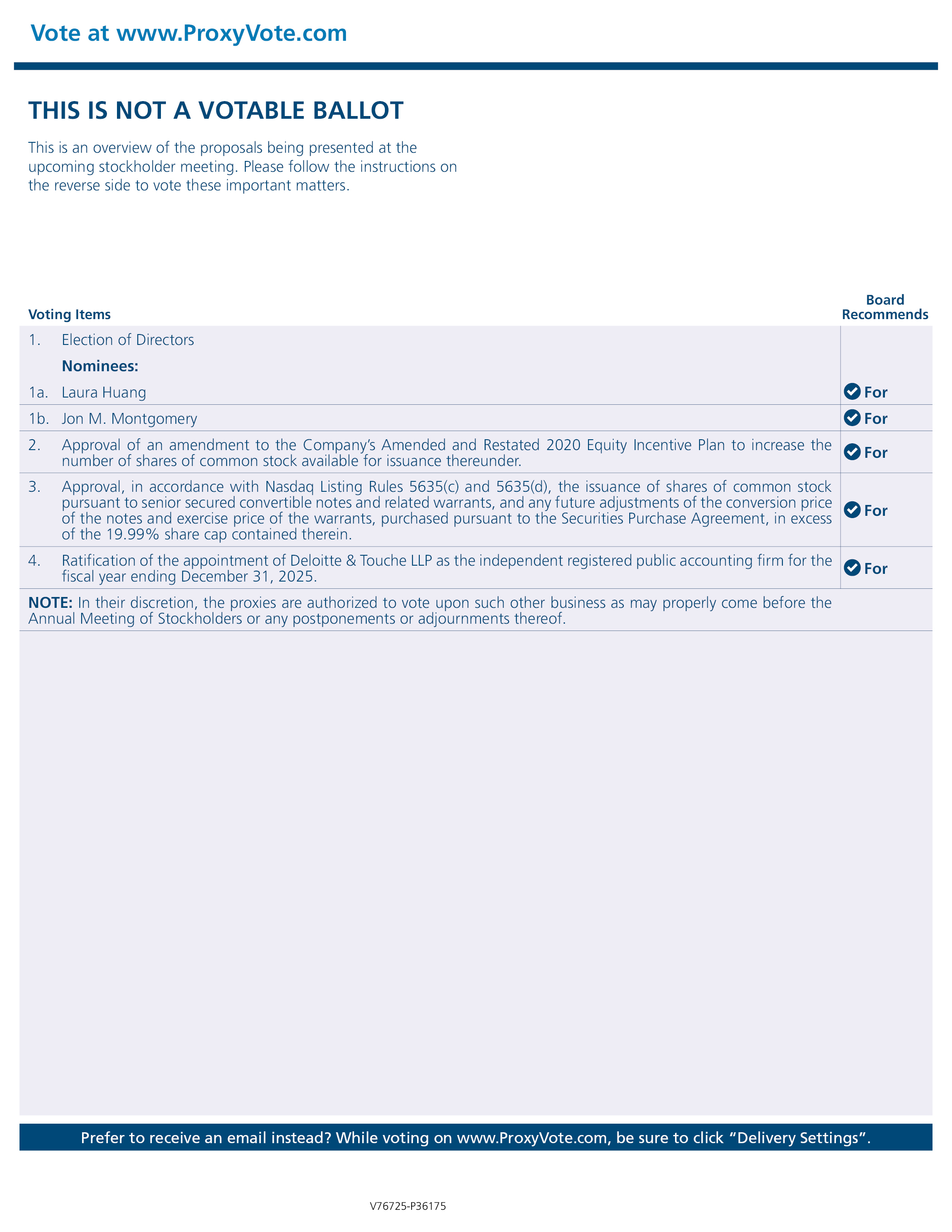 Vote at www.ProxyVote.com THIS IS NOT A VOTABLE BALLOT This is an overview of the proposals being presented at the upcoming stockholder meeting. Please follow the instructions on the reverse side to vote these important matters. Voting Items Board Recommends 1. Election of Directors Nominees: 1a. Laura Huang 1b. Jon M. Montgomery 2. Approval of an amendment to the Company’s Amended and Restated 2020 Equity Incentive Plan to increase the number of shares of common stock available for issuance thereunder. 3. Approval, in accordance with Nasdaq Listing Rules 5635(c) and 5635(d), the issuance of shares of common stock pursuant to senior secured convertible notes and related warrants, and any future adjustments of the conversion price of the notes and exercise price of the warrants, purchased pursuant to the Securities Purchase Agreement, in excess of the 19.99% share cap contained therein. 4. Ratification of the appointment of Deloitte & Touche LLP as the independent registered public accounting firm for the fiscal year ending December 31, 2025. NOTE: In their discretion, the proxies are authorized to vote upon such other business as may properly come before the Annual Meeting of Stockholders or any postponements or adjournments thereof. For Prefer to receive an email instead? While voting on www.ProxyVote.com, be sure to click “Delivery Settings”. V76725-P36175