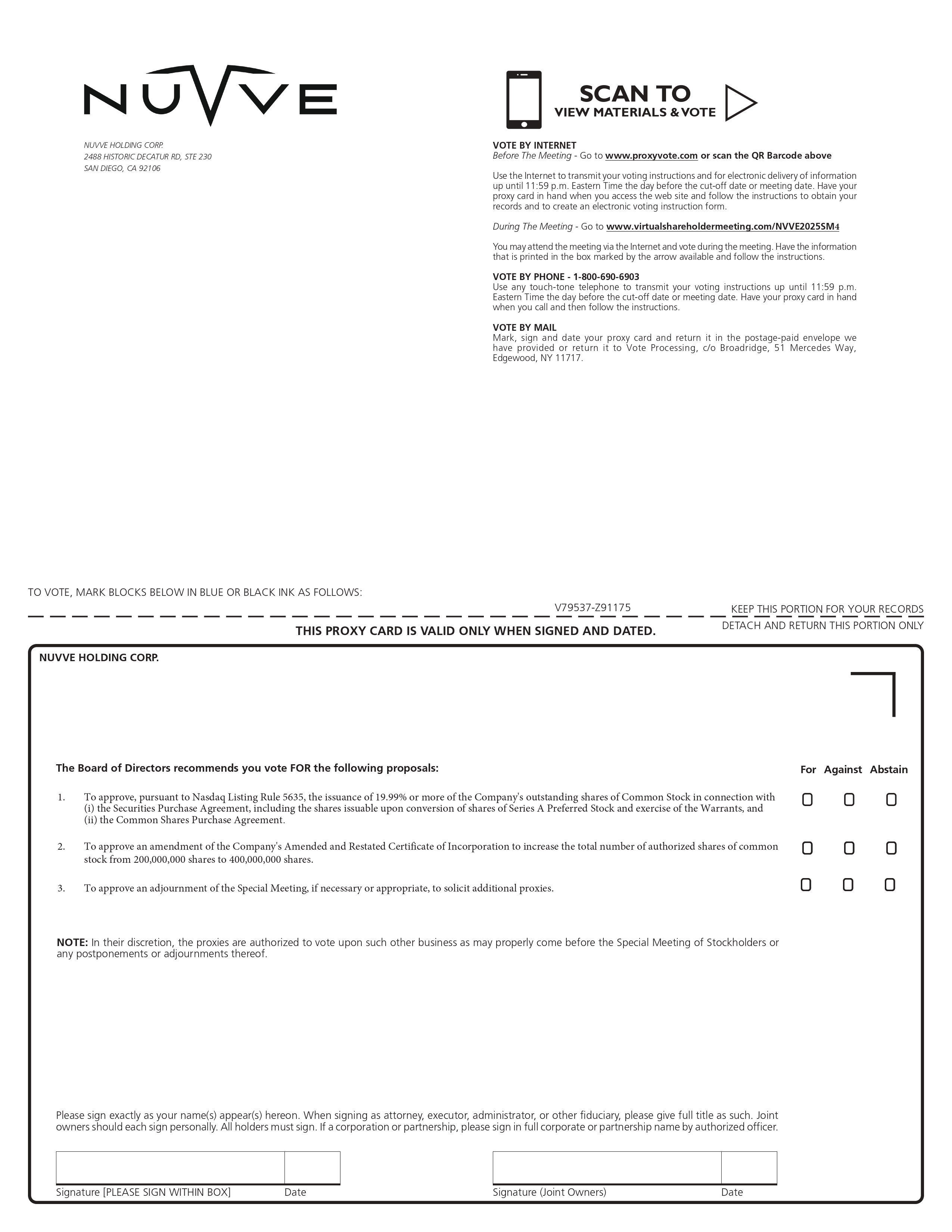 SCAN TO VIEW MATERIALS & VOTE NUVVE HOLDING CORP. 2488 HISTORIC DECATUR RD, STE 230 SAN DIEGO, CA 92106 VOTE BY INTERNET Before The Meeting - Go to www.proxyvote.com or scan the QR Barcode above Use the Internet to transmit your voting instructions and for electronic delivery of information up until 11:59 p.m. Eastern Time the day before the cut-off date or meeting date. Have your proxy card in hand when you access the web site and follow the instructions to obtain your records and to create an electronic voting instruction form. During The Meeting - Go to www.virtualshareholdermeeting.com/NVVE2025SM4 You may attend the meeting via the Internet and vote during the meeting. Have the information that is printed in the box marked by the arrow available and follow the instructions. VOTE BY PHONE - 1-800-690-6903 Use any touch-tone telephone to transmit your voting instructions up until 11:59 p.m. Eastern Time the day before the cut-off date or meeting date. Have your proxy card in hand when you call and then follow the instructions. VOTE BY MAIL Mark, sign and date your proxy card and return it in the postage-paid envelope we have provided or return it to Vote Processing, c/o Broadridge, 51 Mercedes Way, Edgewood, NY 11717. TO VOTE, MARK BLOCKS BELOW IN BLUE OR BLACK INK AS FOLLOWS: V79537-Z91175 KEEP THIS PORTION FOR YOUR RECORDS THIS PROXY CARD IS VALID ONLY WHEN SIGNED AND DATED. DETACH AND RETURN THIS PORTION ONLY Important Notice Regarding the Availability of Proxy Materials for the Special Meeting: The Proxy Statement is available at www.proxyvote.com. V79538-Z91175 NUVVE HOLDING CORP. THIS PROXY IS SOLICITED ON BEHALF OF THE BOARD OF DIRECTORS SPECIAL MEETING OF STOCKHOLDERS December 29, 2025, 1:00 p.m. ET The stockholder(s) hereby appoint(s) Gregory Poilasne and David Robson, or either of them, as proxies, with full power of substitution, to represent and vote, as designated on the reverse side of this ballot, all of the shares of Common Stock of Nuvve Holding Corp. held of record by the undersigned on November 19, 2025, at the Special Meeting of Stockholders to be held virtually by visiting www.virtualshareholdermeeting.com/NVVE2025SM4, on December 29, 2025, and any postponements or adjournments thereof. THIS PROXY, WHEN PROPERLY EXECUTED, WILL BE VOTED AS DIRECTED HEREIN BY THE UNDERSIGNED STOCKHOLDER(S). IF NO DIRECTION IS MADE, THIS PROXY WILL BE VOTED "FOR" PROPOSAL 1, "FOR" PROPOSAL 2, "FOR" PROPOSAL 3, AND IN THE DISCRETION OF THE PROXYHOLDERS ON ANY OTHER MATTER THAT PROPERLY COMES BEFORE THE SPECIAL MEETING OR ANY POSTPONEMENTS OR ADJOURNMENTS THEREOF. Continued and to be signed on reverse side
