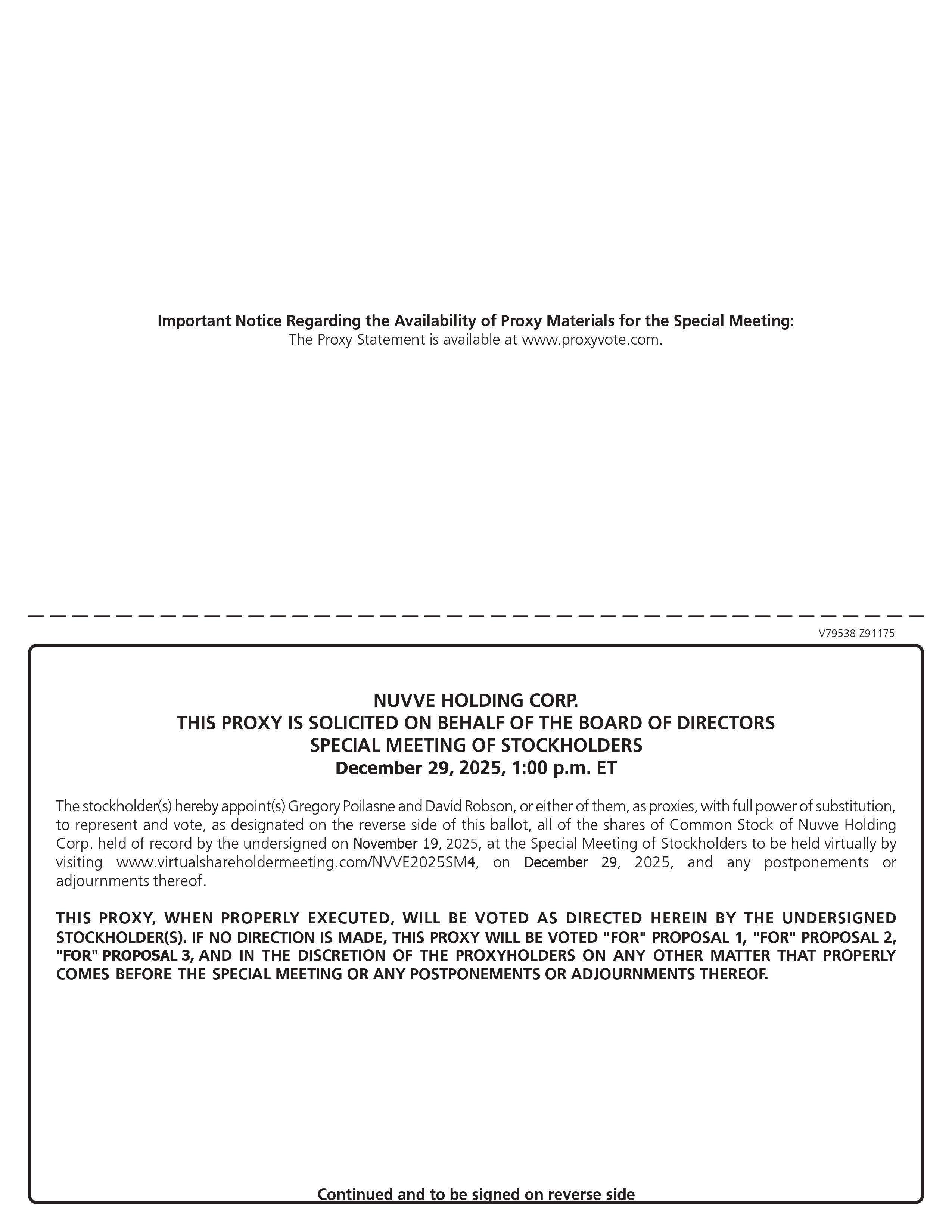 Important Notice Regarding the Availability of Proxy Materials for the Special Meeting: The Proxy Statement is available at www.proxyvote.com. V79538-Z91175 NUVVE HOLDING CORP. THIS PROXY IS SOLICITED ON BEHALF OF THE BOARD OF DIRECTORS SPECIAL MEETING OF STOCKHOLDERS December 29, 2025, 1:00 p.m. ET The stockholder(s) hereby appoint(s) Gregory Poilasne and David Robson, or either of them, as proxies, with full power of substitution, to represent and vote, as designated on the reverse side of this ballot, all of the shares of Common Stock of Nuvve Holding Corp. held of record by the undersigned on November 19, 2025, at the Special Meeting of Stockholders to be held virtually by visiting www.virtualshareholdermeeting.com/NVVE2025SM4, on December 29, 2025, and any postponements or adjournments thereof. THIS PROXY, WHEN PROPERLY EXECUTED, WILL BE VOTED AS DIRECTED HEREIN BY THE UNDERSIGNED STOCKHOLDER(S). IF NO DIRECTION IS MADE, THIS PROXY WILL BE VOTED "FOR" PROPOSAL 1, "FOR" PROPOSAL 2, "FOR" PROPOSAL 3, AND IN THE DISCRETION OF THE PROXYHOLDERS ON ANY OTHER MATTER THAT PROPERLY COMES BEFORE THE SPECIAL MEETING OR ANY POSTPONEMENTS OR ADJOURNMENTS THEREOF. Continued and to be signed on reverse side
