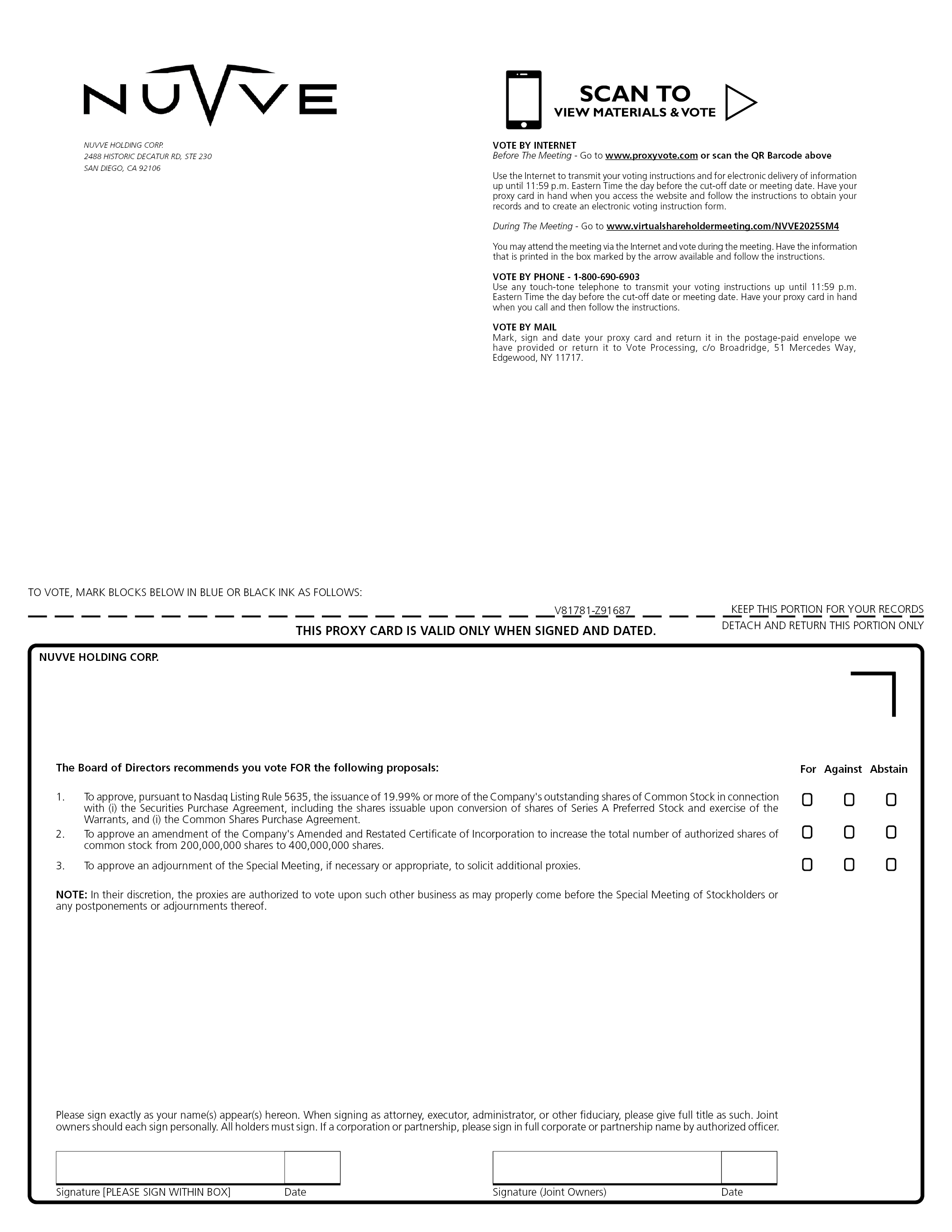 NUVVE HOLDING CORP. 2488 HISTORIC DECATUR RD, STE 230 SAN DIEGO, CA 92106 SCAN TO VIEW MATERIALS & VOTE VOTE BY INTERNET Before The Meeting - Go to www.proxyvote.com or scan the QR Barcode above Use the Internet to transmit your voting instructions and for electronic delivery of information up until 11:59 p.m. Eastern Time the day before the cut-off date or meeting date. Have your proxy card in hand when you access the website and follow the instructions to obtain your records and to create an electronic voting instruction form. During The Meeting - Go to www.virtualshareholdermeeting.com/NVVE2025SM4 You may attend the meeting via the Internet and vote during the meeting. Have the information that is printed in the box marked by the arrow available and follow the instructions. VOTE BY PHONE - 1-800-690-6903 Use any touch-tone telephone to transmit your voting instructions up until 11:59 p.m. Eastern Time the day before the cut-off date or meeting date. Have your proxy card in hand when you call and then follow the instructions. VOTE BY MAIL Mark, sign and date your proxy card and return it in the postage-paid envelope we have provided or return it to Vote Processing, c/o Broadridge, 51 Mercedes Way, Edgewood, NY 11717. TO VOTE, MARK BLOCKS BELOW IN BLUE OR BLACK INK AS FOLLOWS: V81781-Z91687 KEEP THIS PORTION FOR YOUR RECORDS THIS PROXY CARD IS VALID ONLY WHEN SIGNED AND DATED. DETACH AND RETURN THIS PORTION ONLY NUVVE HOLDING CORP. The Board of Directors recommends you vote FOR the following proposals: 1. To approve, pursuant to Nasdaq Listing Rule 5635, the issuance of 19.99% or more of the Company’s outstanding shares of Common Stock in connection with (i) the Securities Purchase Agreement, including the shares issuable upon conversion of shares of Series A Preferred Stock and exercise of the Warrants, and (i) the Common Shares Purchase Agreement. 2. To approve an amendment of the Company’s Amended and Restated Certificate of Incorporation to increase the total number of authorized shares of common stock from 200,000,000 shares to 400,000,000 shares. 3. To approve an adjournment of the Special Meeting, if necessary or appropriate, to solicit additional proxies. NOTE: In their discretion, the proxies are authorized to vote upon such other business as may properly come before the Special Meeting of Stockholders or any postponements or adjournments thereof. For Against Abstain Please sign exactly as your name(s) appear(s) hereon. When signing as attorney, executor, administrator, or other fiduciary, please give full title as such. Joint owners should each sign personally. All holders must sign. If a corporation or partnership, please sign in full corporate or partnership name by authorized officer. Signature [PLEASE SIGN WITHIN BOX] Date Signature (Joint Owners) Date
