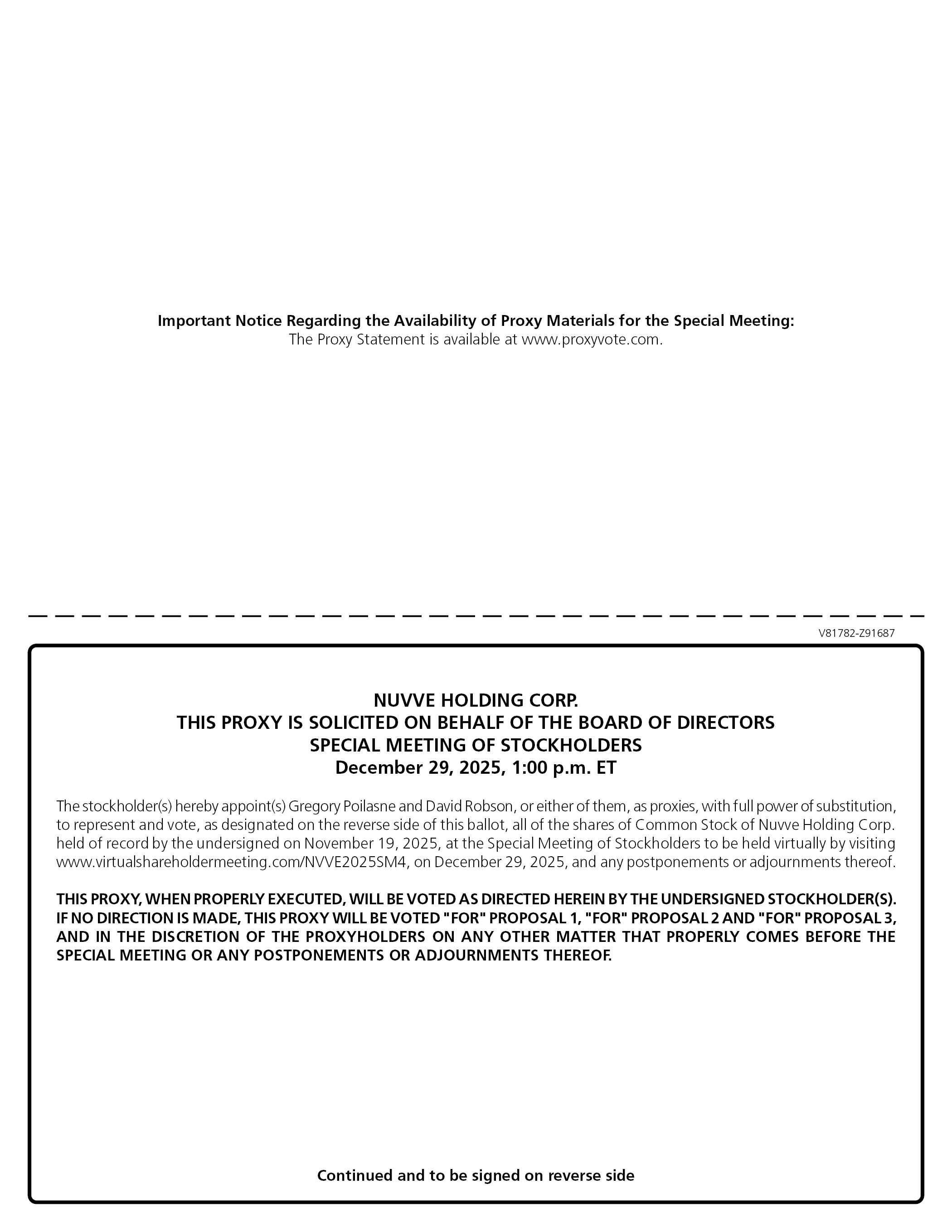 Important Notice Regarding the Availability of Proxy Materials for the Special Meeting: The Proxy Statement is available at www.proxyvote.com. V81782-Z91687 NUVVE HOLDING CORP. THIS PROXY IS SOLICITED ON BEHALF OF THE BOARD OF DIRECTORS SPECIAL MEETING OF STOCKHOLDERS December 29, 2025, 1:00 p.m. ET The stockholder(s) hereby appoint(s) Gregory Poilasne and David Robson, or either of them, as proxies, with full power of substitution, to represent and vote, as designated on the reverse side of this ballot, all of the shares of Common Stock of Nuvve Holding Corp. held of record by the undersigned on November 19, 2025, at the Special Meeting of Stockholders to be held virtually by visiting www.virtualshareholdermeeting.com/NVVE2025SM4, on December 29, 2025, and any postponements or adjournments thereof. THIS PROXY, WHEN PROPERLY EXECUTED, WILL BE VOTED AS DIRECTED HEREIN BY THE UNDERSIGNED STOCKHOLDER(S). IF NO DIRECTION IS MADE, THIS PROXY WILL BE VOTED “FOR” PROPOSAL 1, “FOR” PROPOSAL 2 AND “FOR” PROPOSAL 3,AND IN THE DISCRETION OF THE PROXYHOLDERS ON ANY OTHER MATTER THAT PROPERLY COMES BEFORE THE SPECIAL MEETING OR ANY POSTPONEMENTS OR ADJOURNMENTS THEREOF. Continued and to be signed on reverse side